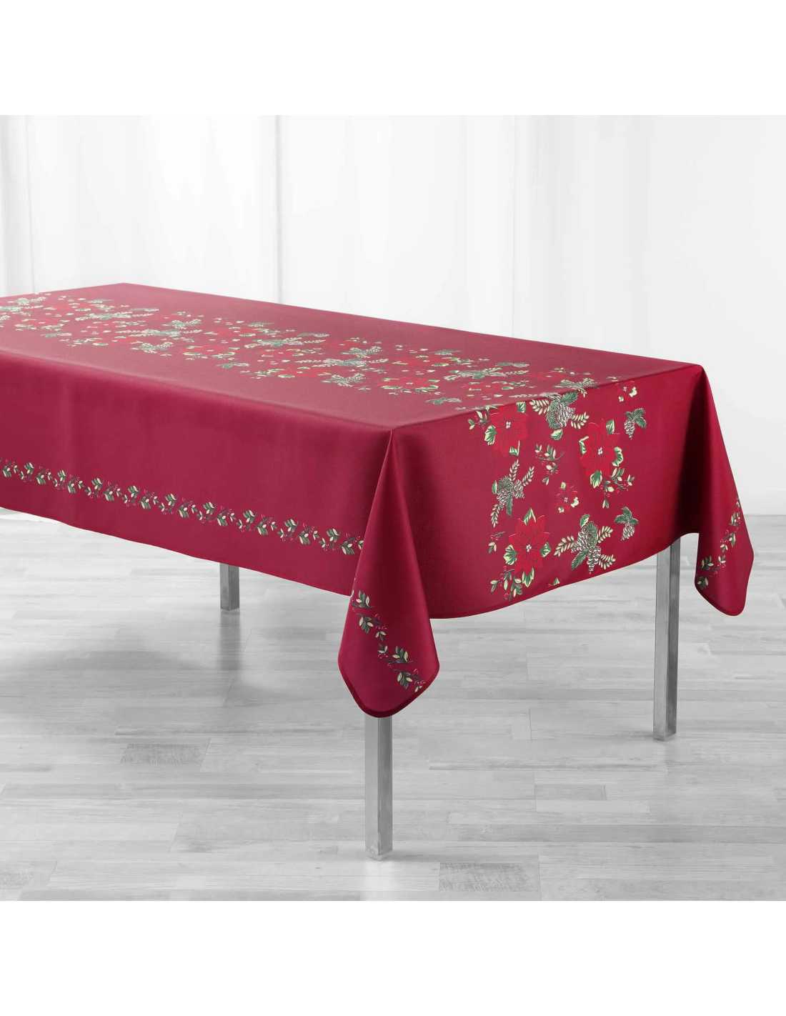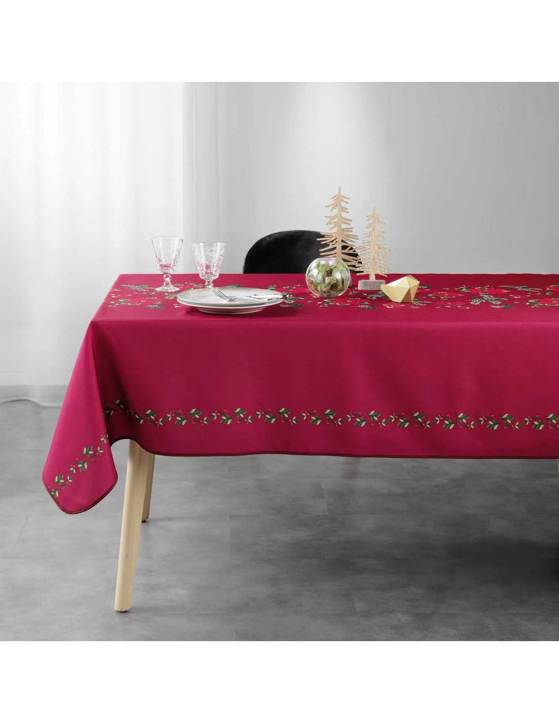 Nappe rouge Isadora 150 x 300 cm, élégante, antitache, infroissable et parfaite pour 10 à 12 couverts. Ambiance chaleureuse.