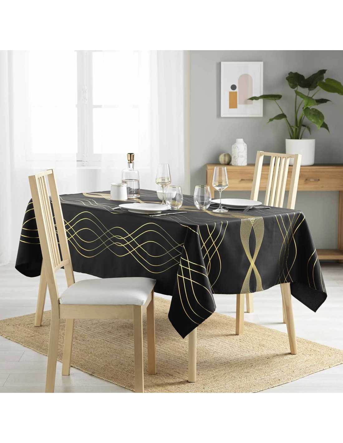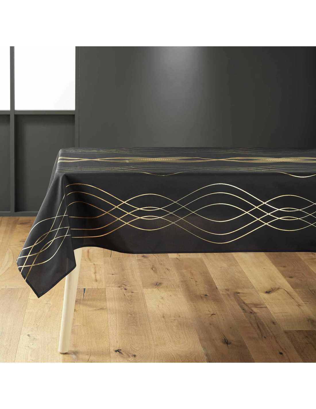 Nappe noir/or motif Elona en 150 x 240 cm, antitache et infroissable, parfaite pour un Noël chic.