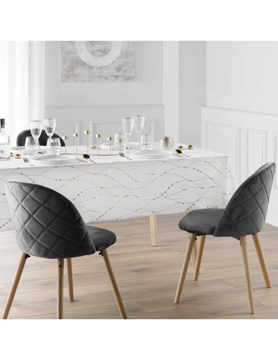 La nappe Firmament en blanc et or évoque un ciel étoilé, parfait pour enrichir vos repas d’une atmosphère douce et magique.