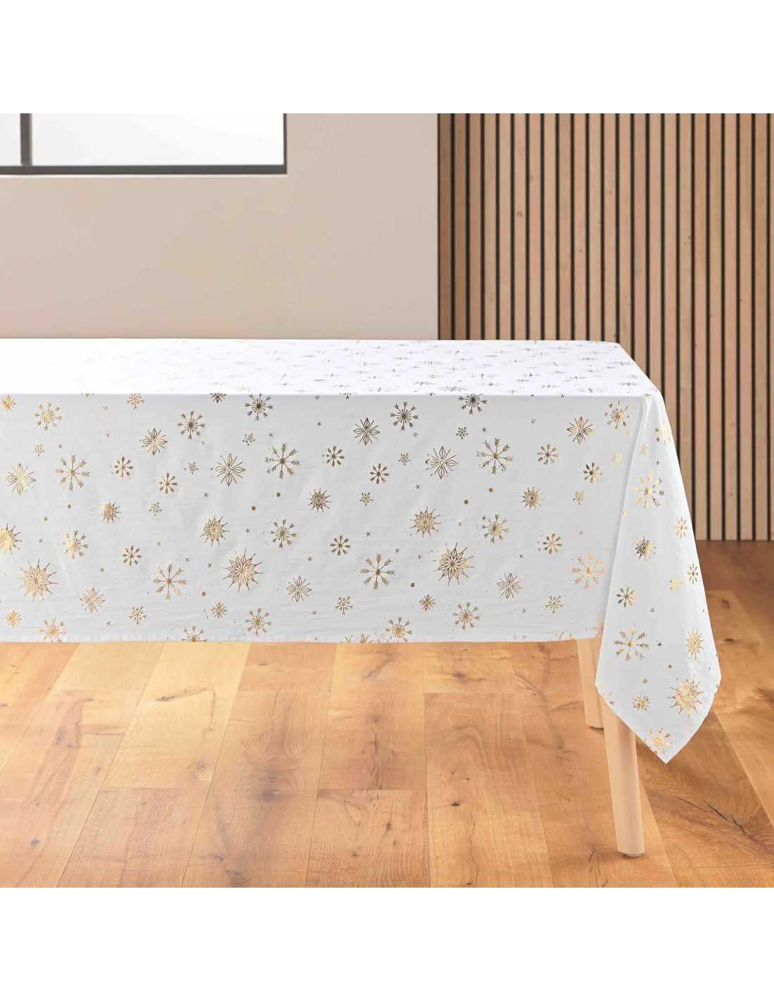 Nappe de Noël blanc et or 150 x 300 cm, antitache, infroissable et parfaite pour 10 à 12 couverts. Élégance festive assurée.