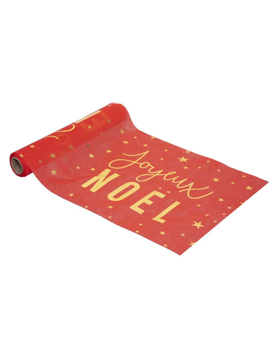 Chemin de table rouge 28 x 300 cm inscription "Joyeux Noël" or. Message festif pour une table de Noël joyeuse et chaleureuse.