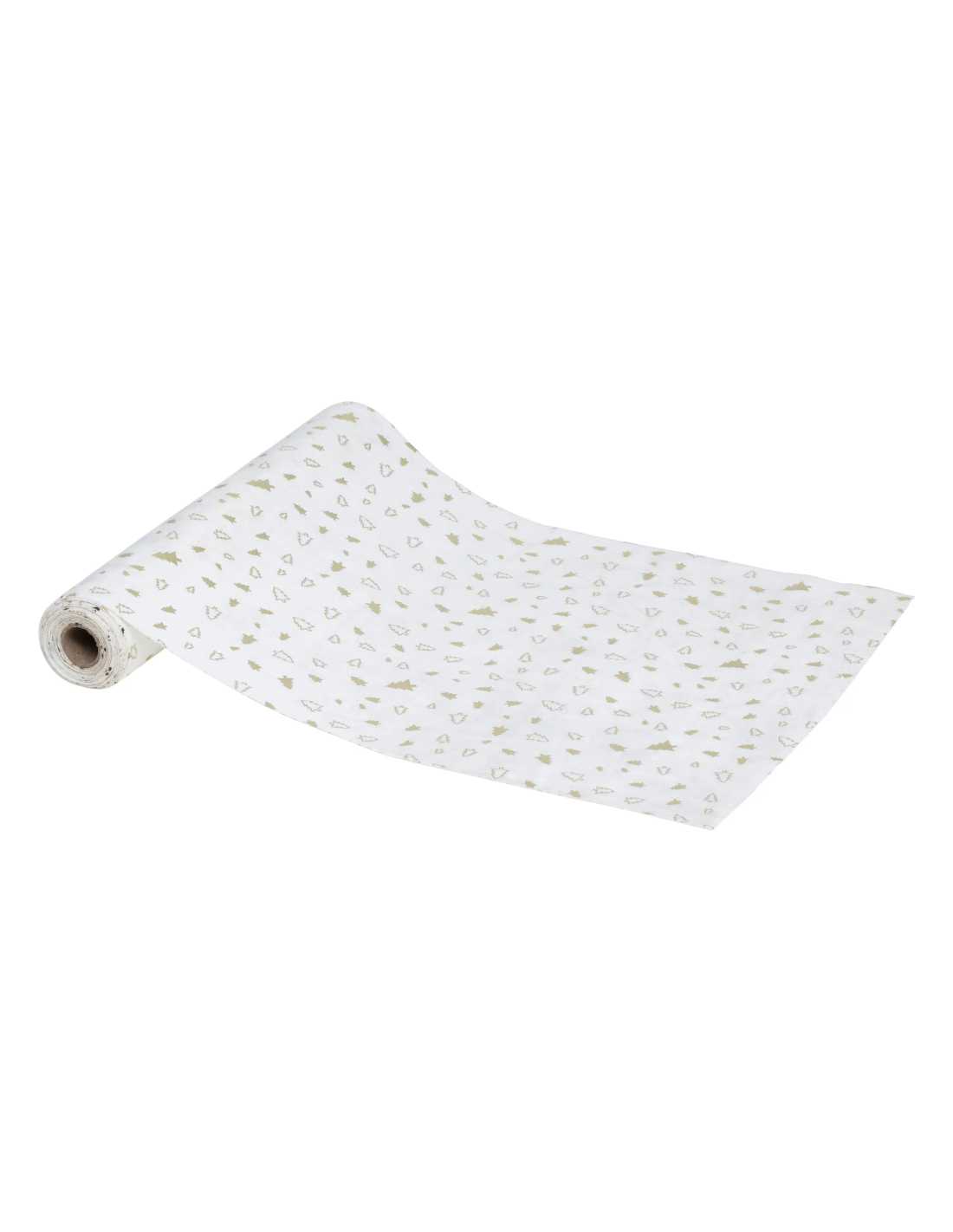 Chemin de table velours blanc 28 x 300 cm avec motifs sapins dorés. Douceur et élégance festive pour votre table de Noël.