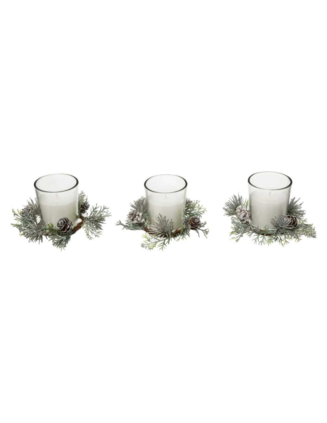 Lot de 3 photophores centre de table avec décoration branche sapin et pomme de pin. Ambiance forestière pour vos tables de Noël.