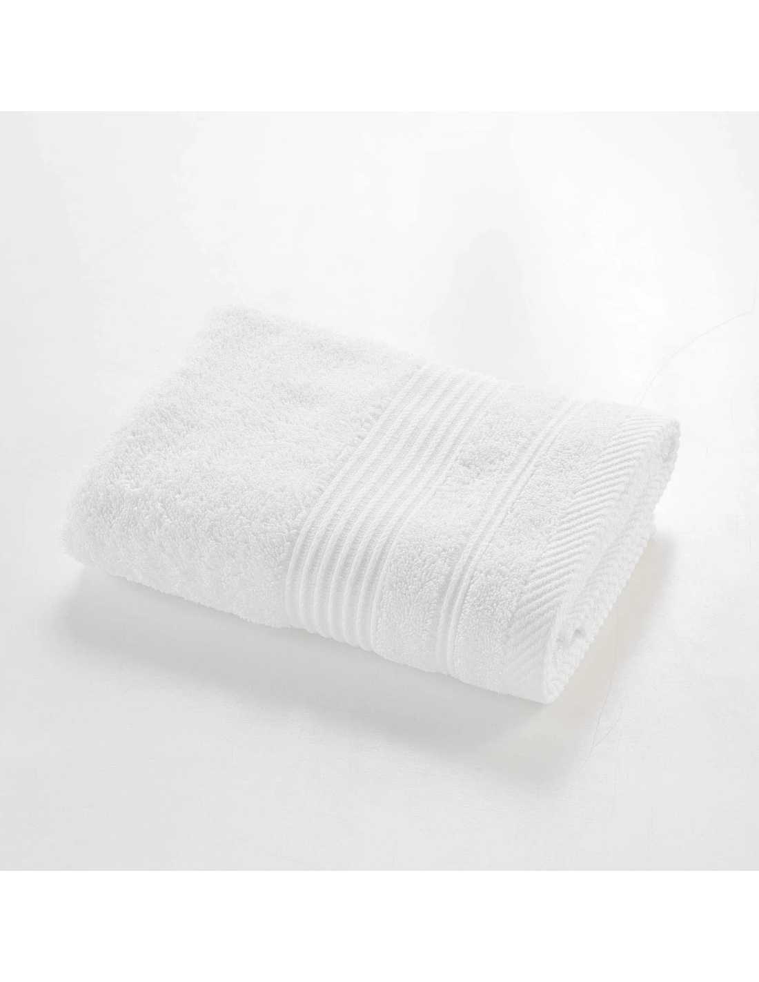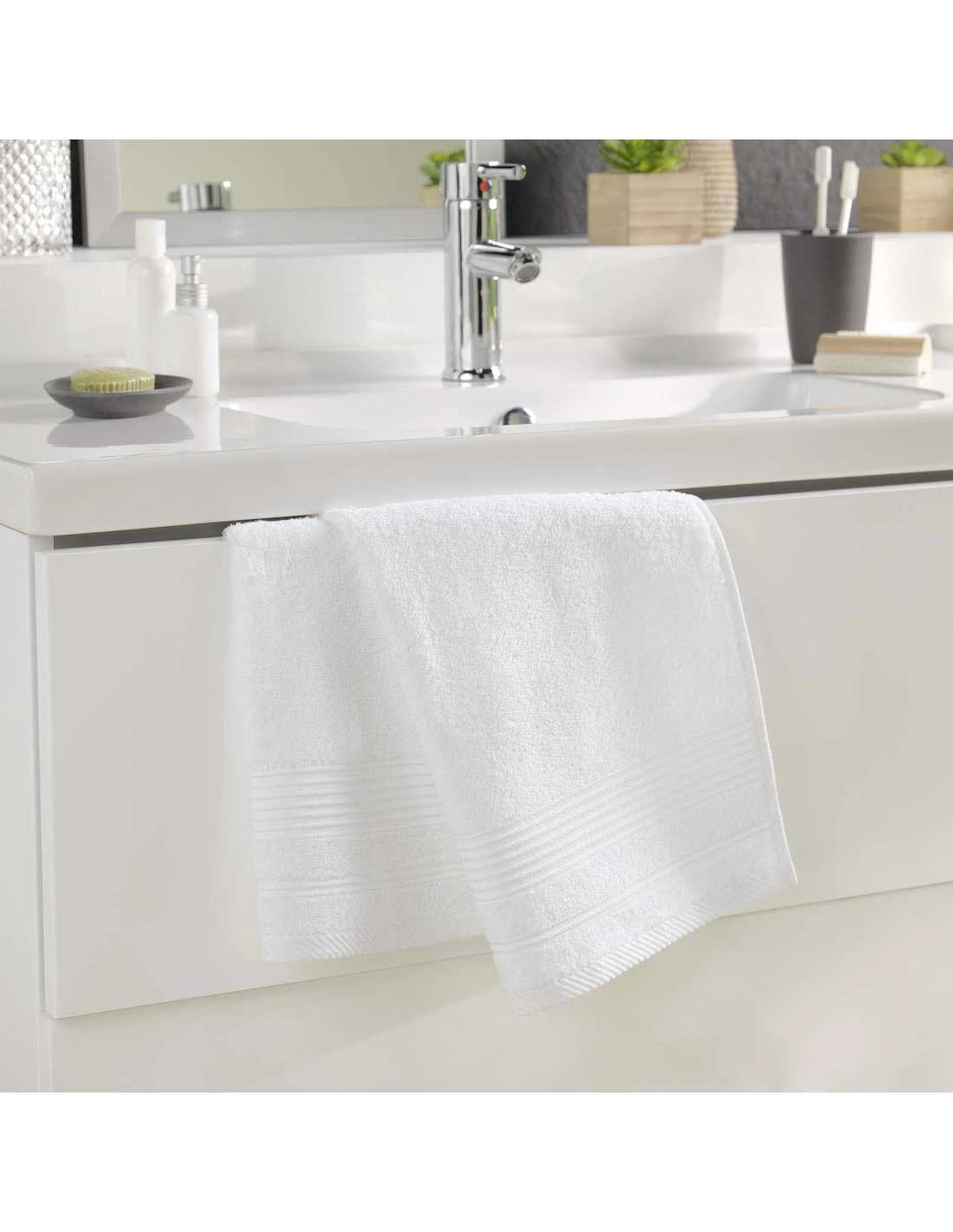 Serviette de toilette blanc 50x90 cm en éponge unie 500g/m². Le format polyvalent du quotidien, doux et absorbant. Collection Tendresse.