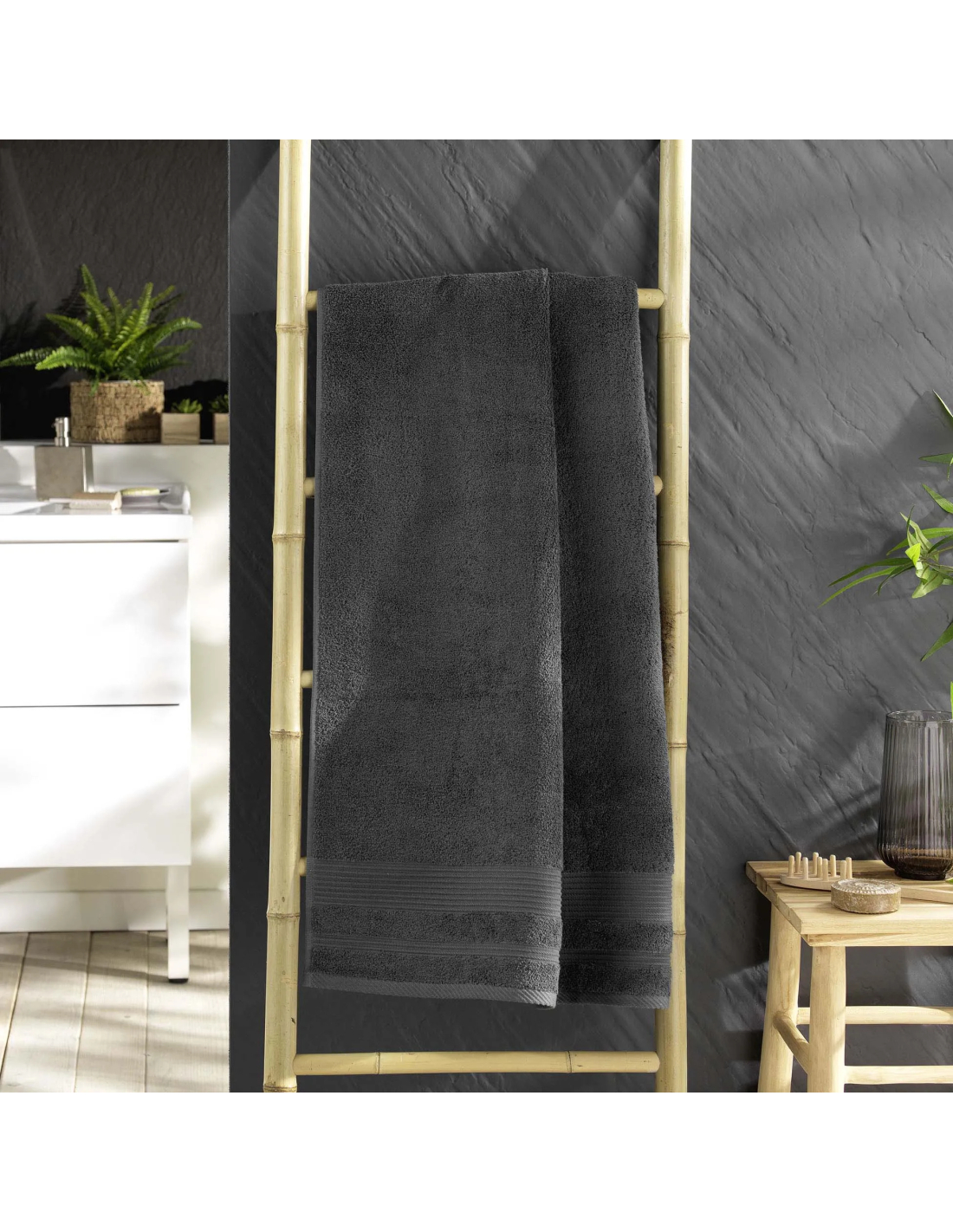 Grand drap de bain gris anthracite 90x150 cm en éponge unie 500g/m². Enveloppant et ultra-absorbant pour un moment de bien-être total. Collection Tendresse.
