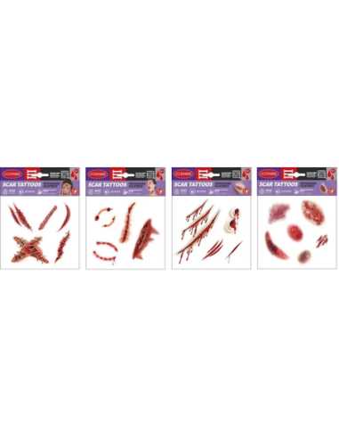Tatouages cicatrices Halloween pour un maquillage effrayant et ultra réaliste. Faciles à appliquer et à retirer, ces tatouages temporaires transforment votre peau en un décor de film d’horreur. 4 modèles au choix pour compléter votre déguisement et surprendre vos proches.