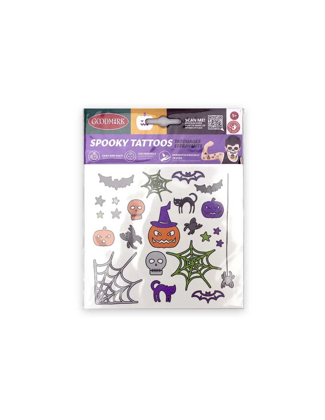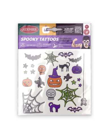Tatouages temporaires Halloween pour le corps et le visage, faciles à appliquer et à retirer. Avec des motifs de toiles d'araignée, crânes, chauves-souris et citrouilles, ces tatouages apportent un look festif et effrayant en quelques secondes.