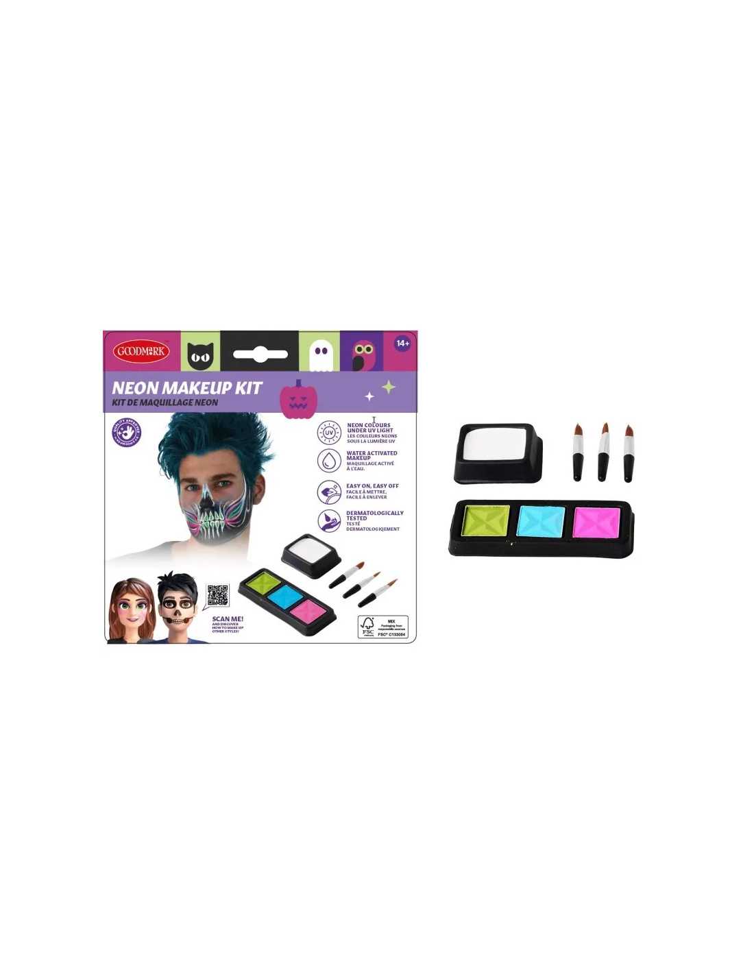Kit maquillage Halloween Néon pour créer des looks fluorescents et effrayants. Comprend du maquillage blanc et 3 couleurs néon (vert, bleu, rose) pour des effets lumineux et spectaculaires lors de fêtes, cosplay ou spectacles.