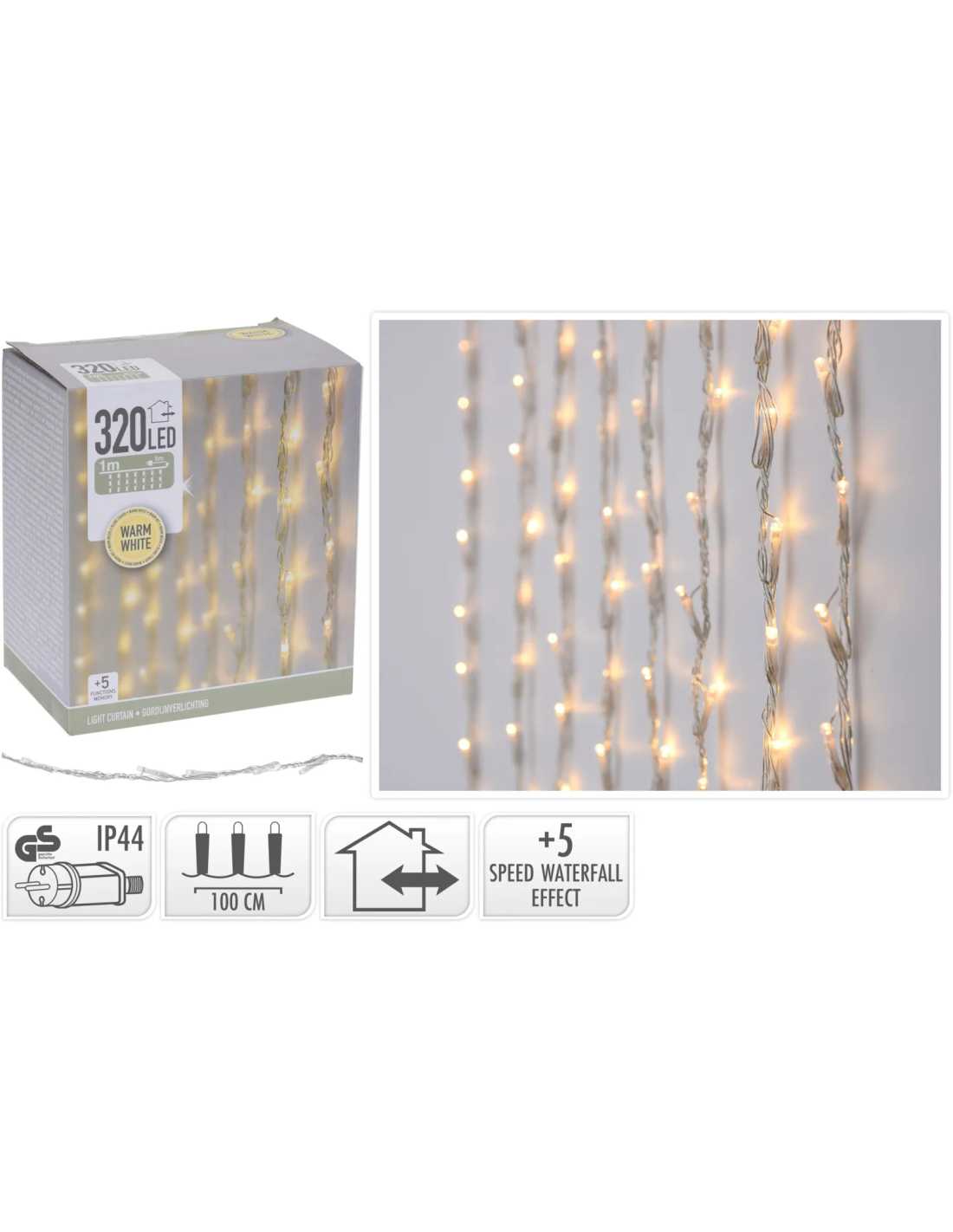 Apportez une touche féerique à vos décorations avec ce rideau LED blanc chaud de 1 mètre sur 2. Ses 320 LED créent un effet chutes d’eau captivant qui illumine fenêtres, murs ou terrasses, en intérieur comme en extérieur.