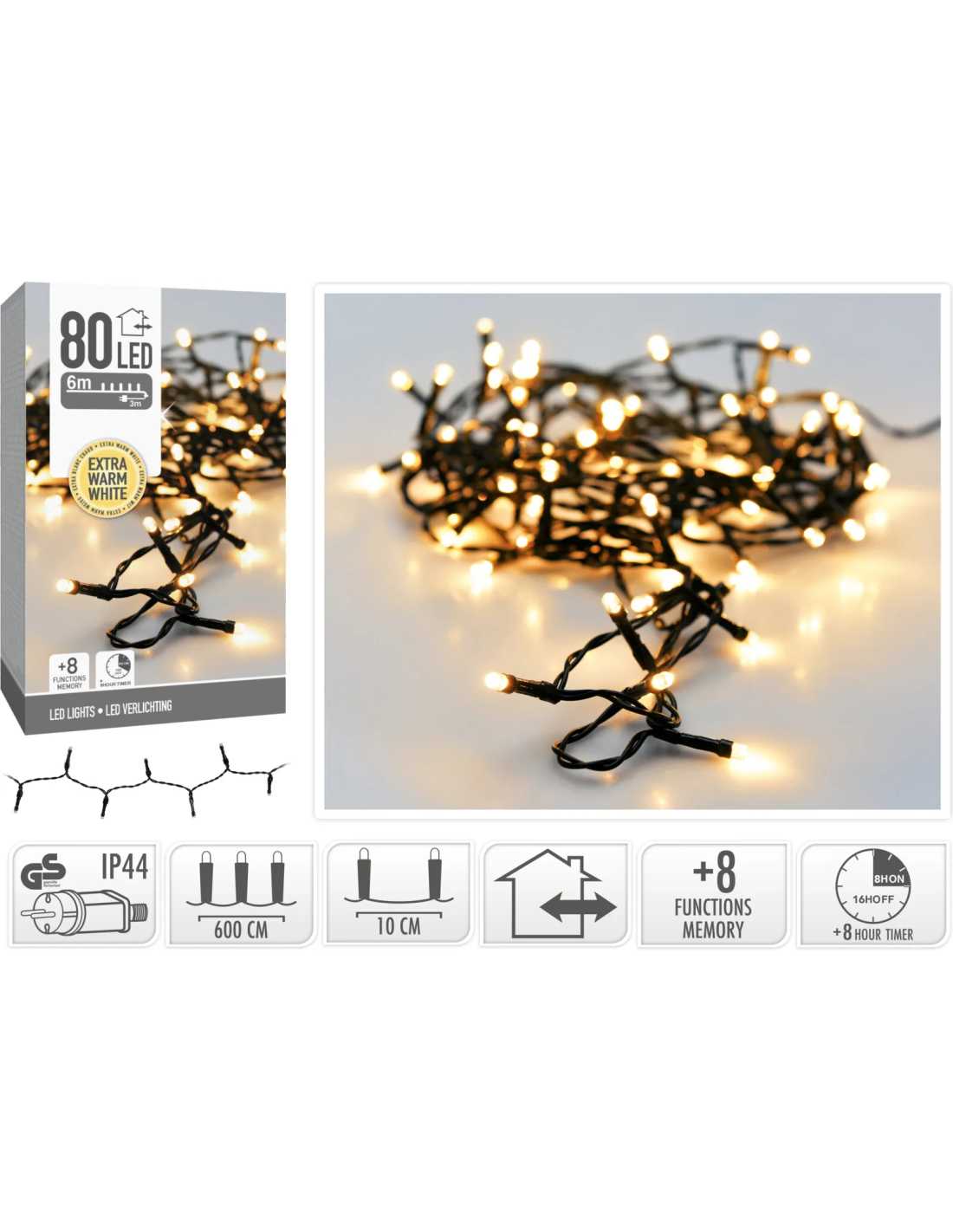 Illuminez votre déco avec cette guirlande LED 6m de 80 LED blanc chaud. 8 fonctions, timer 8h et usage intérieur ou extérieur.