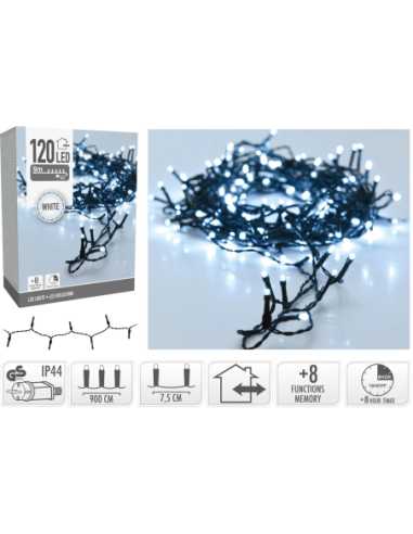 Illuminez vos fêtes avec cette guirlande LED 9m de 120 LED blanc froid. 8 fonctions, timer 8h et usage intérieur ou extérieur.