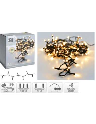 Illuminez vos grandes décorations avec cette guirlande LED 24m de 320 LED blanc chaud. 8 fonctions, timer 8h, usage intérieur et extérieur.