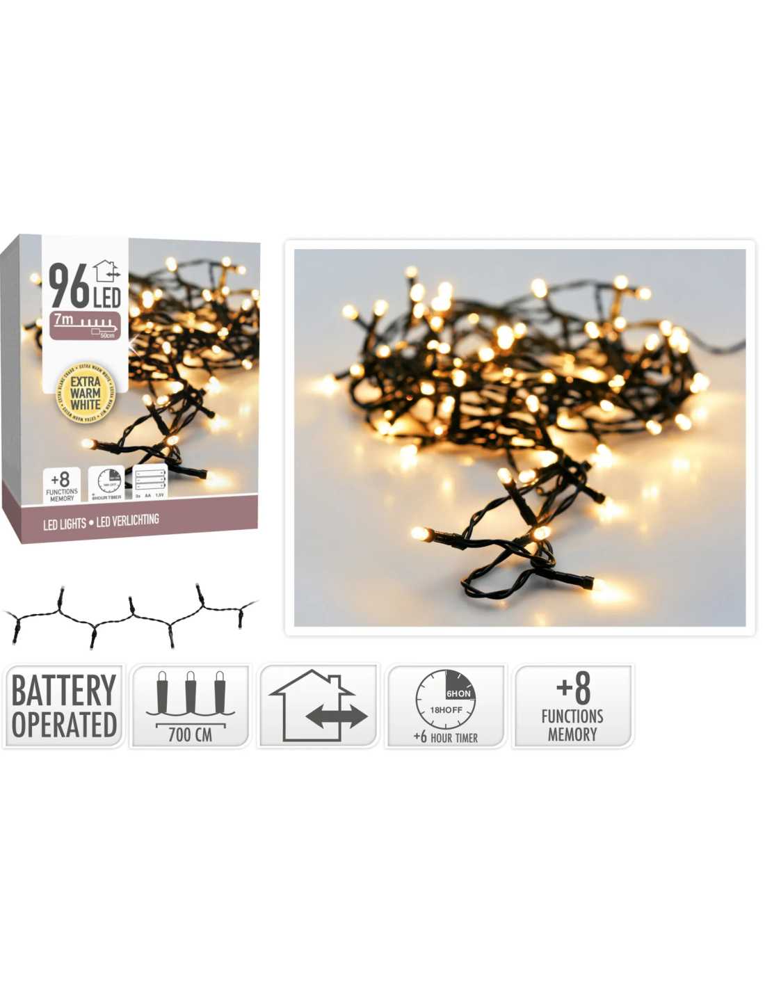 Guirlande lumineuse LED 7m avec 96 LED blanc chaud, 8 fonctions programmées et timer 6h. Fonctionne avec 3 piles AA (non fournies), intérieur et extérieur.