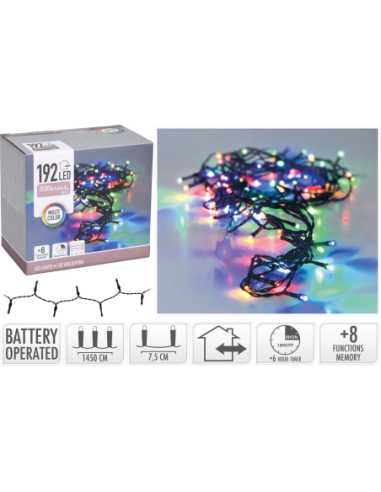 Guirlande lumineuse LED 14.5m avec 192 LED multicolores, 8 fonctions programmées et timer 6h. Fonctionne avec 3 piles AA (non fournies), intérieur et extérieur.