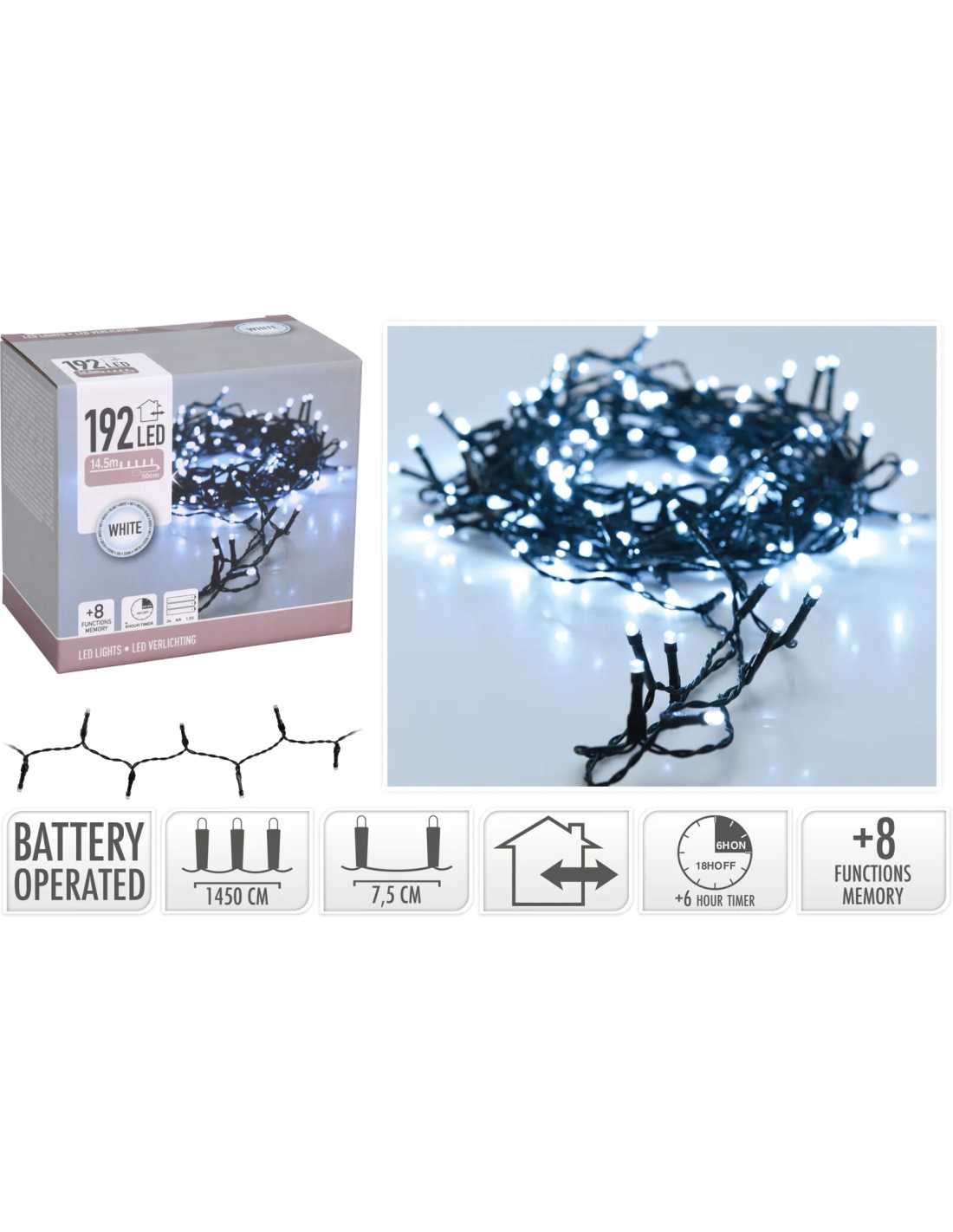 Guirlande lumineuse LED 14.5m avec 192 LED blanc froid, 8 fonctions programmées et timer 6h. Fonctionne avec 3 piles AA (non fournies), intérieur et extérieur.