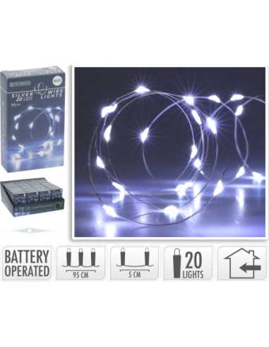 Guirlande MicroLED 95 cm avec 20 LED blanc froid sur fils argentés. Fonctionne à piles, usage intérieur. Idéale pour petites décorations.