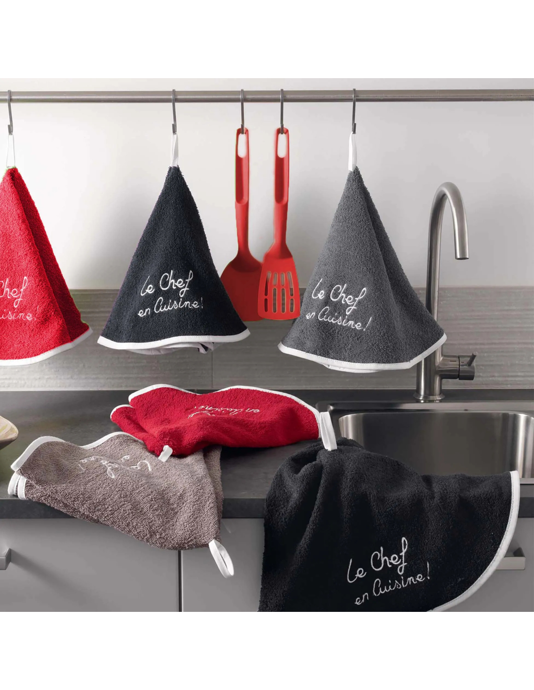 Essuie-main rond Ø60 cm en éponge brodée rouge. Pratique et stylé pour votre cuisine. Collection Cuistot.